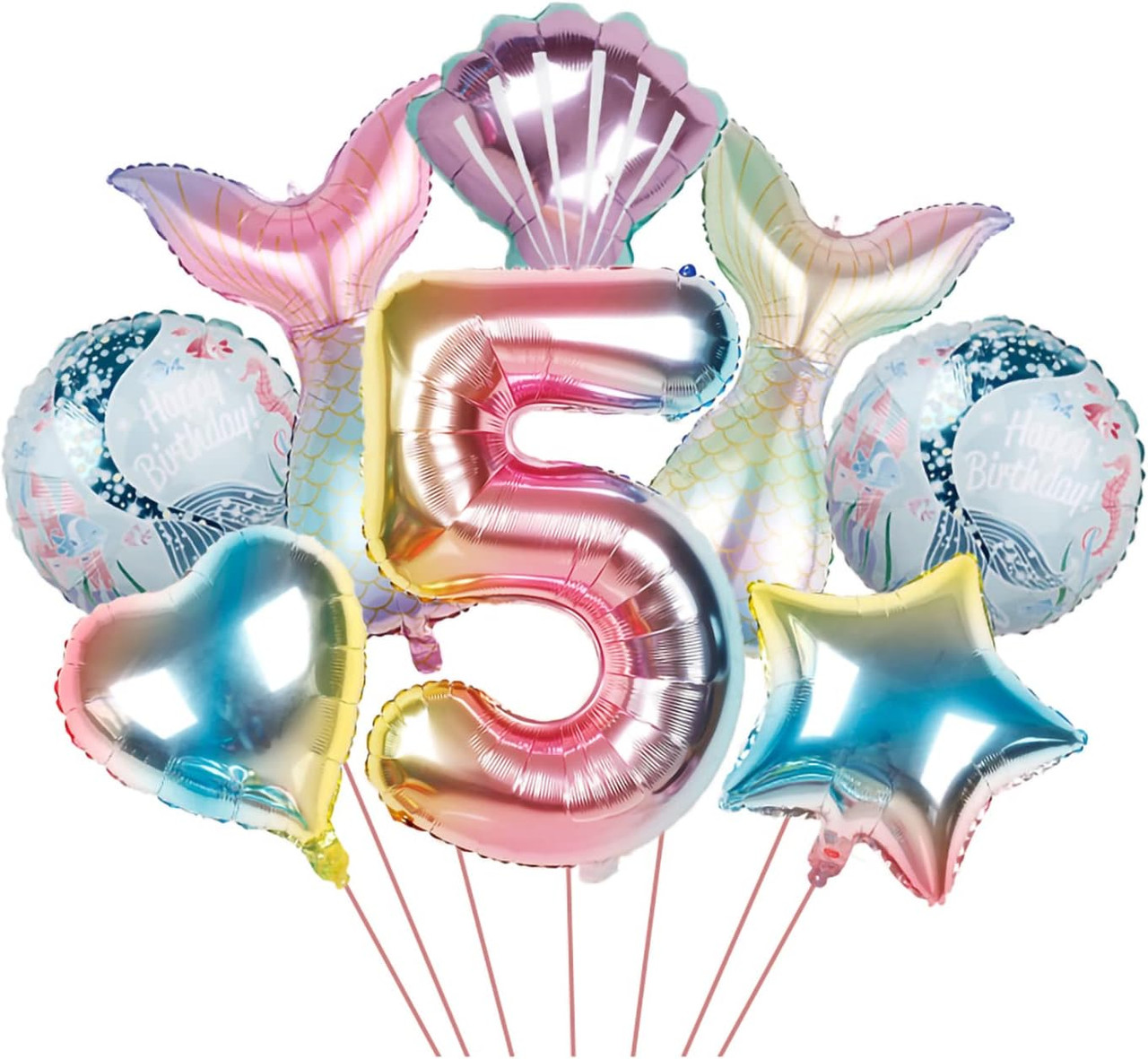 This Mermaid Birthday Balloon Bouquets is great for decorations or gifts.  2 Mermaid Tail Foil , A Large Number Balloon, 1 Shell Balloons, and 2 Under the Sea Mermaid Theme Balloons, and a star and a heart make up this bouquet.  Great for Girls' Birthday Parties.